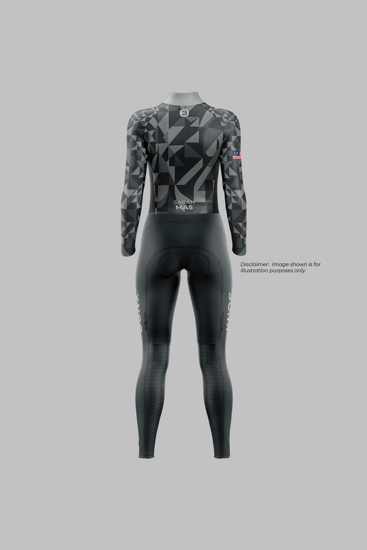 • Back Panel: Integrated pockets for race essentials, finished with ‘NAME / COUNTRY’ insignia on lower back.